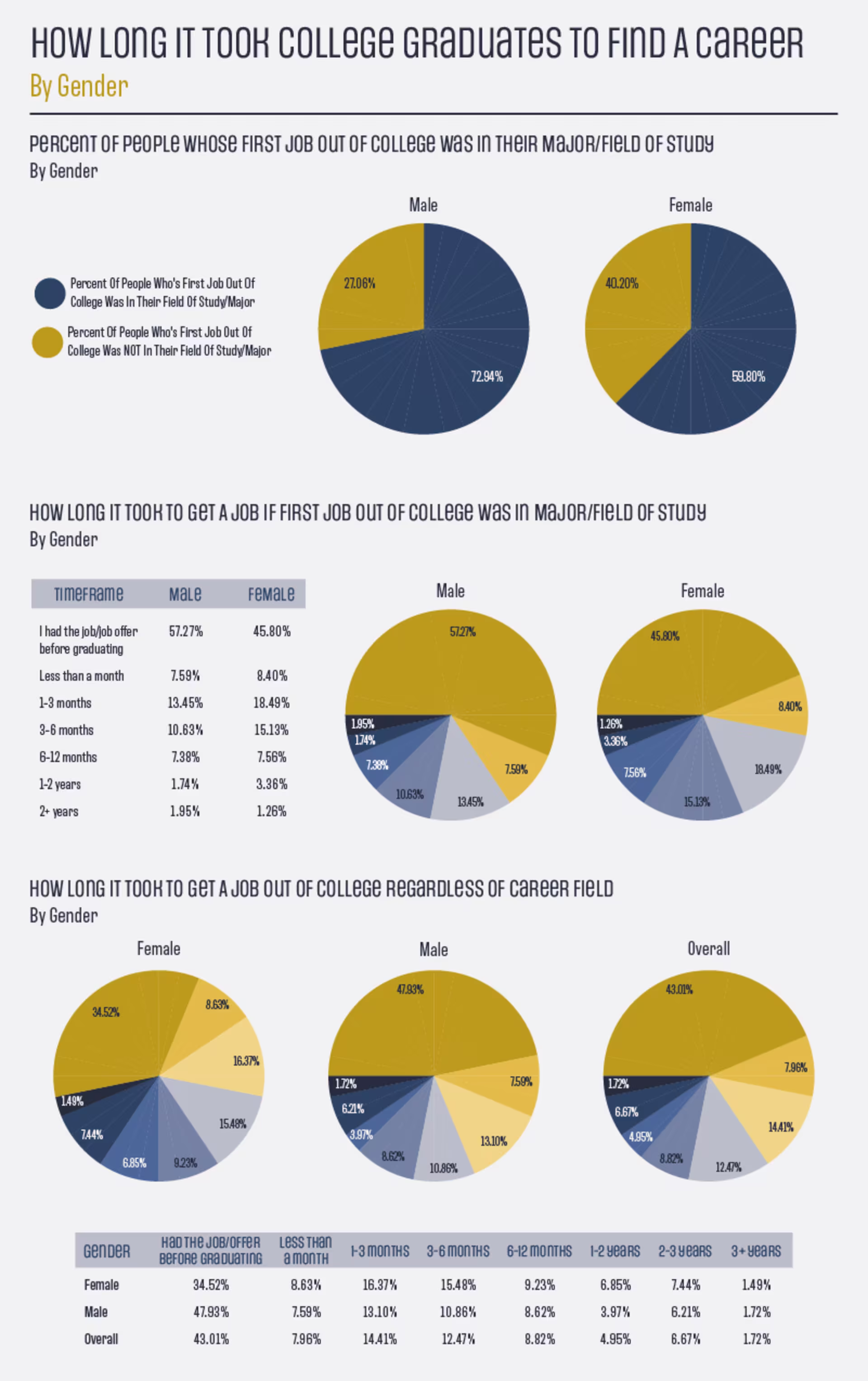 We started by looking at more surface-level data, finding out how long it took college graduates to find their first job (if that job was in the same field they studied in college), if their first job was NOT in their field of study, and how long it took to find their first job overall.