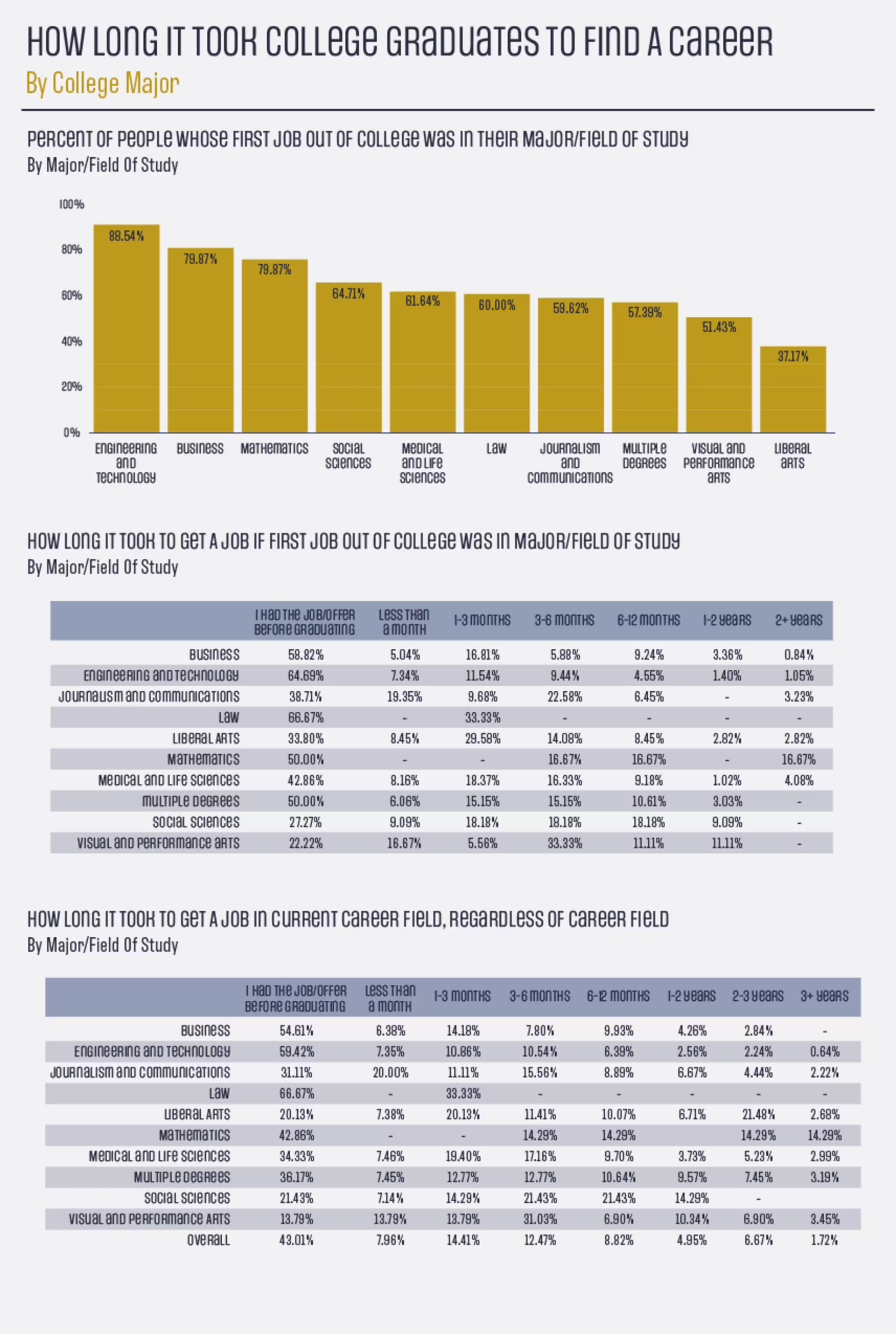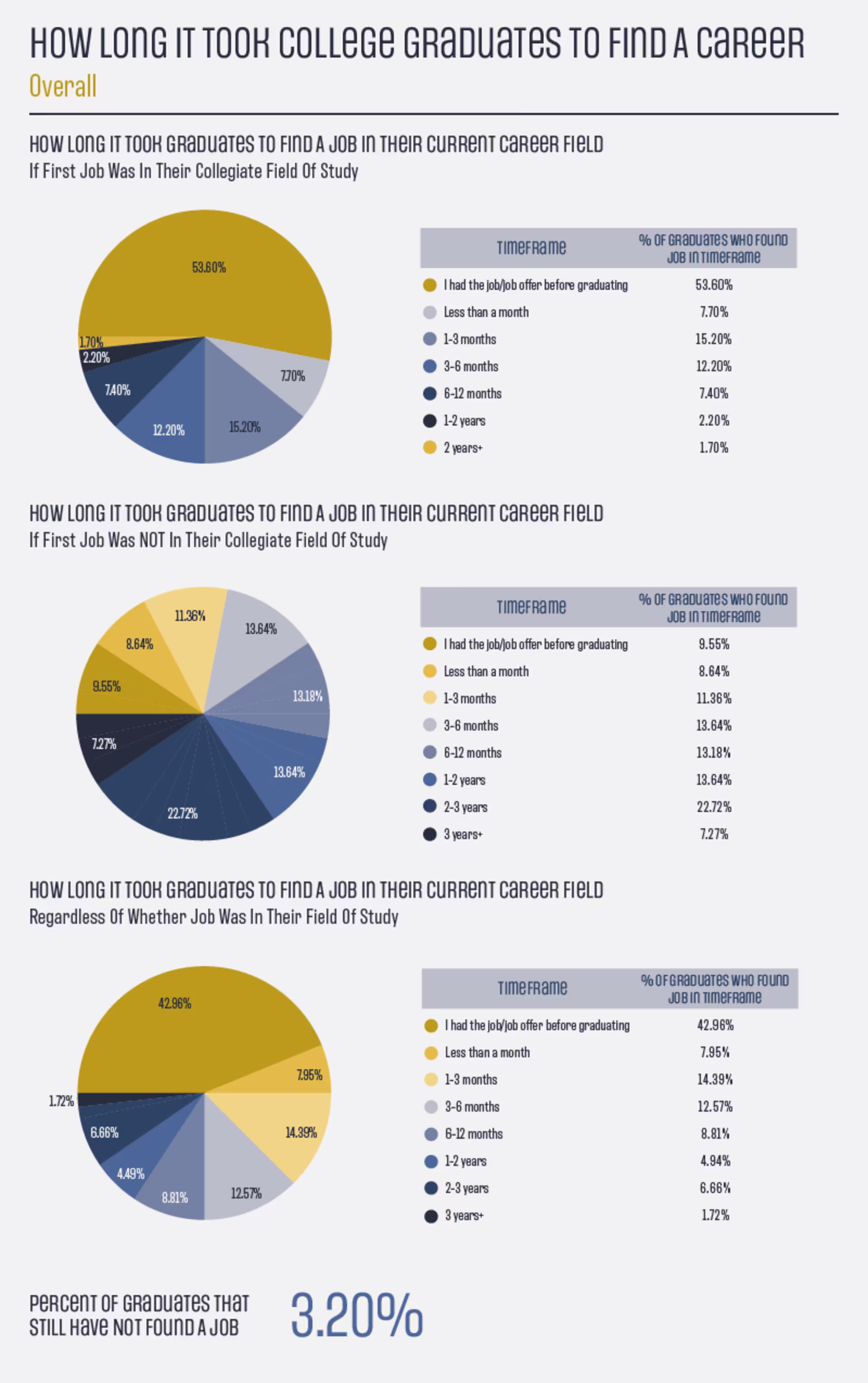 Unsurprisingly, graduates who currently work in a field that is different from their college major found it harder to start their careers. Less than 10% of people that description applies to had a job or job offer before graduation, with nearly 30% of these grads taking 2 years or more the begin their long-term careers.