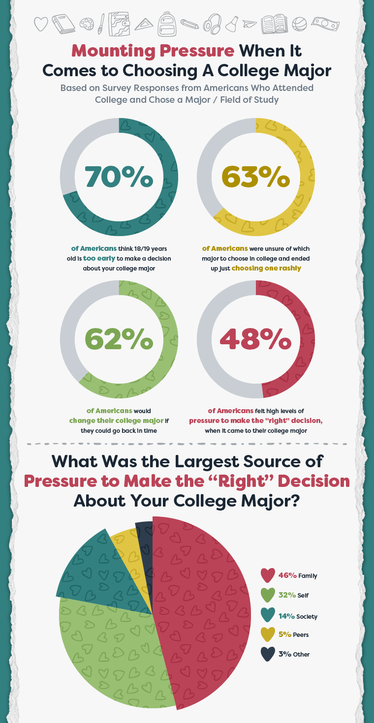 Finally, we decided to look at the biggest sources of stress when it comes to choosing a college major. Seventy percent of Americans feel that 18 or 19 (the typical age of freshmen) is too early to decide on a major. Additionally, 48% felt high levels of pressure to make the right decision when it came to their college major. These two findings likely tie into each other. Viewing a college major as the end-all, be-all for career success puts a significant amount of pressure on a fresh high school graduate who may or may not know what their life’s calling is yet. So if nearly half of Americans feel pressured to choose the right major, it’s no wonder that 70% feel that the weight of this decision is too heavy for an 18-year-old’s shoulders.