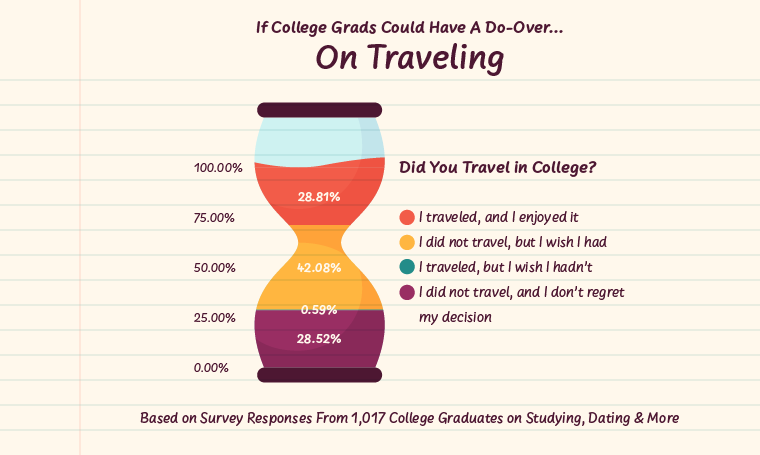 Of all the college experiences that respondents wish they would have done in college, travel takes the cake as one of the biggest regrets. Nearly half (42%) of the graduates who were interviewed did not travel during college but wish they had. At the time, students may have been faced with time or monetary restraints that made adventuring difficult. Luckily, there’s time to travel throughout the rest of your life, so rest assured the world will be waiting for you when you’re ready.