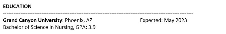 Although you haven’t quite completed your nursing degree yet, you’ll still have a section on your resume labeled “EDUCATION.” List the full name of your school, its location, your expected graduation date, and your nursing degree. If your grade point average (GPA) is impressively high, you might also choose to include that. Here’s an example of what this will look like: