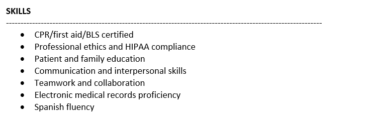 List all certifications you hold, such as basic life support certifications. Here’s an example of what this section might look like on your nursing student resume: